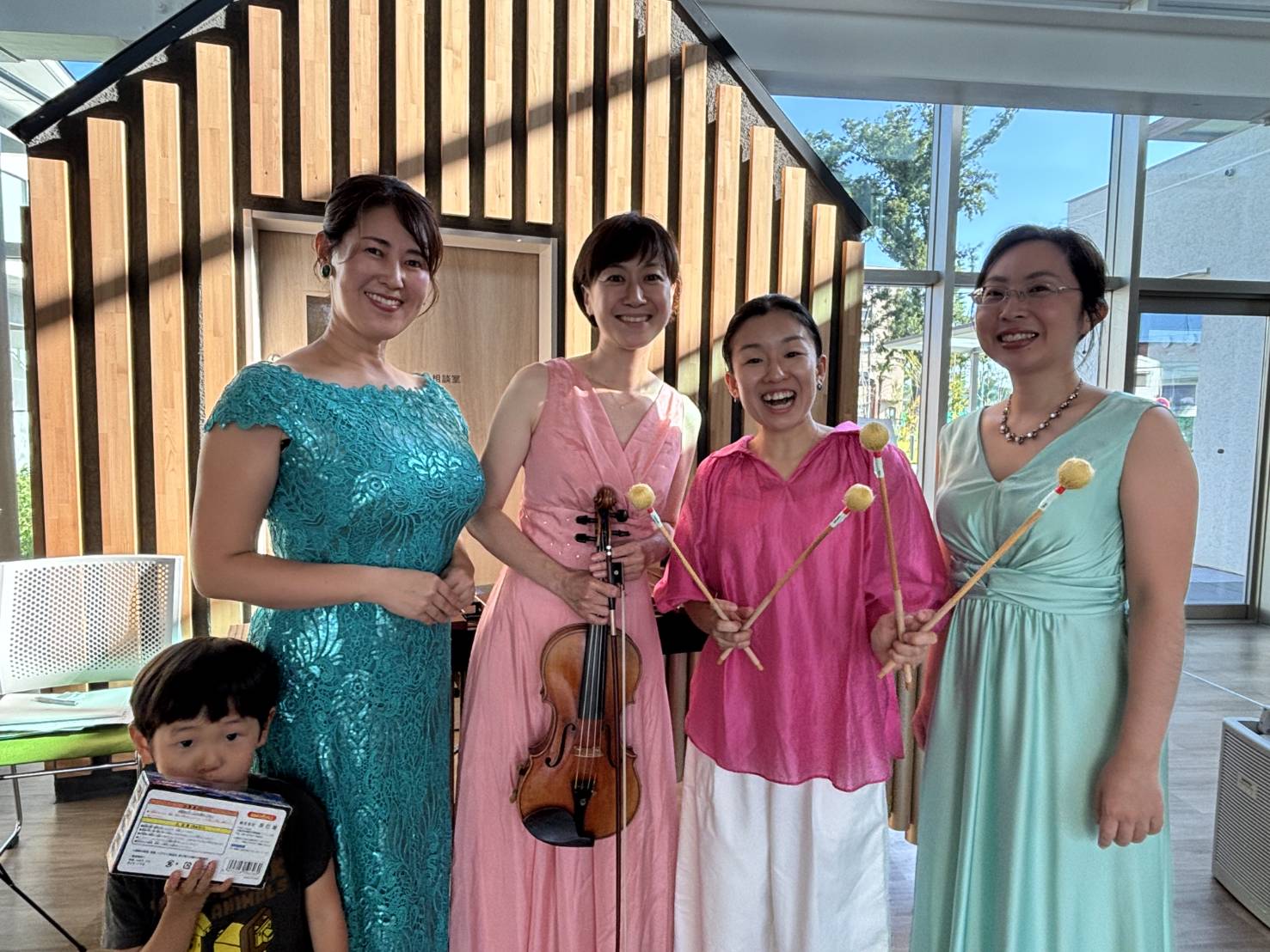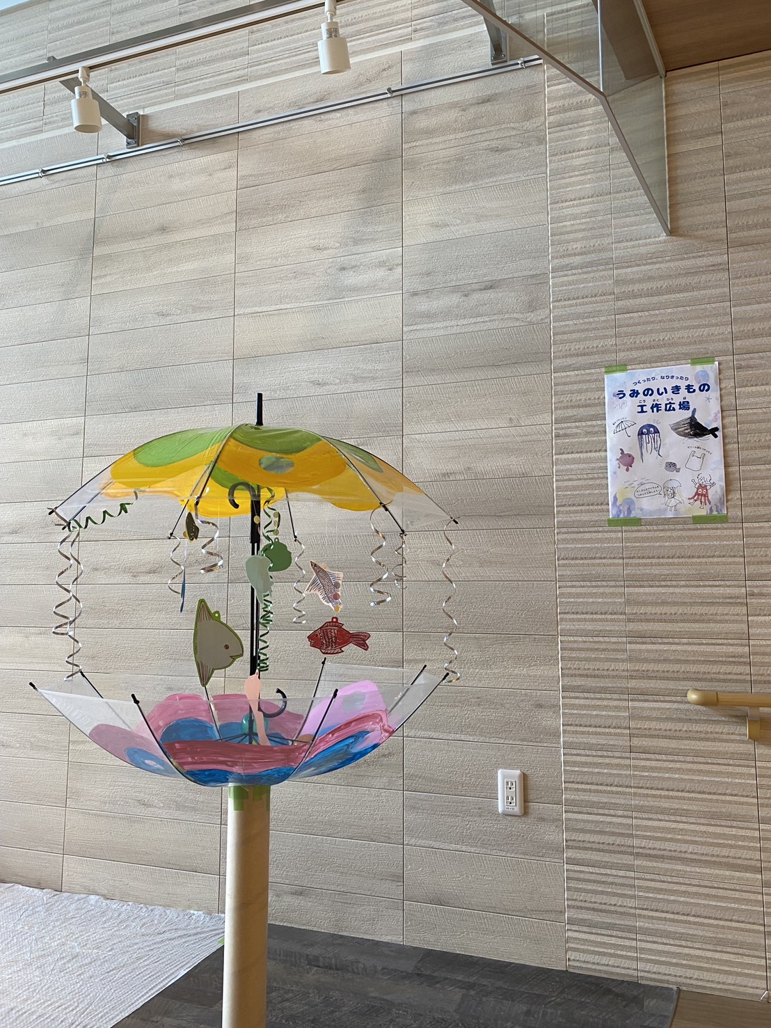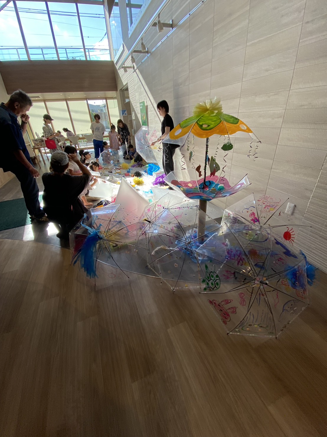 waaa 初の他市出張型イベント、「大地の歌 ~ぼくらはみんな生きている」の開催が無事終了いたしました。 他市ということもあり、準備に行ったり来たりのプチ旅行感がありましたが、小金井とは違った風景の面々を楽 しむことが出来ました。緑豊かな場所に建つ「喜望園」は、開放的でゆるりとした時間が流れています。 地域に開かれた施設で、地域に開かれたイベントということもあって、当日は喜望園の利用者様をはじめとした 地域の方々が織り交ざった素敵な会となりました。エプソンのプロジェクションマッピングに合わせた生演奏は 好評で、視覚と聴覚に響いたコンサートとなりました。また、ロビーでの営巣は、グランドピアノの響きとマリ ンバやバイオリン、声楽といった本物の響きが施設全体に響き渡り、多くの利用者さんたちが響きに引き寄せら れて鑑賞されていました。演奏の合間には、カフェでの美味しいランチでお客さん同士が情報交換の交流があっ たり、学芸大学の学生さんによるワークショップで、水族館をイメージしたものづくりに子どもたちの制作意欲 が発揮されたり、イベント全体が賑わい豊かな空間となりました。ワークショップで作った作品を持って廊下を 走る子どもたちの姿は、なんだか昭和の良き時代の遊びが甦ったようで、ご来場者の方々が優しく微笑んでいま した。障がいのある人もない人も、一緒に楽しむイベントを企画する waaa としては、成功の一つになったので はないかと思っています。楽しい場所で知り合った人、仲良くなった人がたまたま障がいのある人だった。そん な何気ない日常が良いですね。